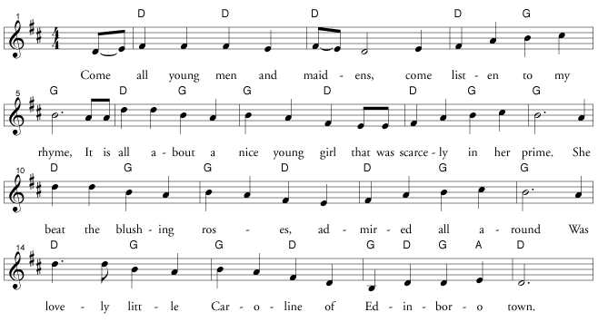 The tune here is one that Brian Miller learned from Irish sources — which makes it not unlikely that it is the tune Dean used, since Dean knew a lot of Irish songs. Other Irish versions of this are sung to a tune also known as “The Flower of Sweet Strabane” (though that song is thought to date from the 1840s, making it more recent than “Caroline”).