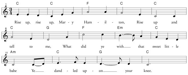 Arise, arise, Mary Hamilton, Arise and tell tae me What thou hast done with thy wee bairn I saw and heard greet by thee. |