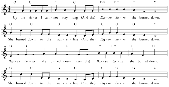 The known versions of songs about the Bayou Sara are extremely diverse — so much so that it is entirely reasonable to ask whether they are actually a single song. But I know of no other song about a riverboat disaster with a better tune, so I decided to offer this one even though it does not seem to have been found in Minnesota. The basis for this version is that sung by Sara Grey and Ellie Ellis on “Making the Air Resound,” slightly modified so that the song does not require a banjo accompaniment (on the Grey/Ellis recording, the last four lines of the verse instead become a chorus, with no repetition of the third line, and the second line of the chorus is played by the instrument — no singing). I’ve taken a few words from other sources to give a more complete story.