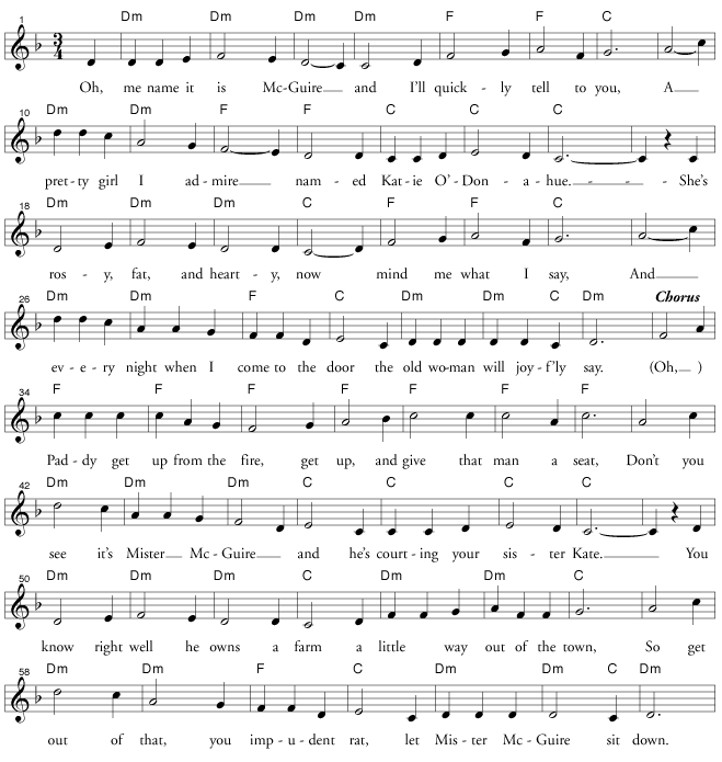 In a third version, the singer proves to be less wealthy than expected; they mother turns on him in a final verse; in the last chorus, instead of telling the boy Paddy to give his chair to McGuire, she declares, “So stay where you are, and never you dare Let Mr. McGuire sit down.”