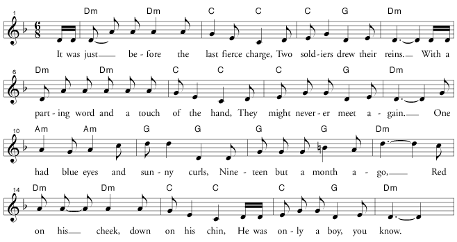 This is as close as we come to a song about Gettysburg. It’s not really about any specific battle. It’s certainly not about the First Minnesota, which was an infantry unit, and the soldiers here are cavalrymen! But a few versions mention Gettysburg, though more mention the Battle of Fredericksburg, and a few relate to other battles in other wars, such as Bunker Hill or Custer at the Little Bighorn! But let us act as if it is about two soldiers of the First Minnesota; they certainly earned a song!